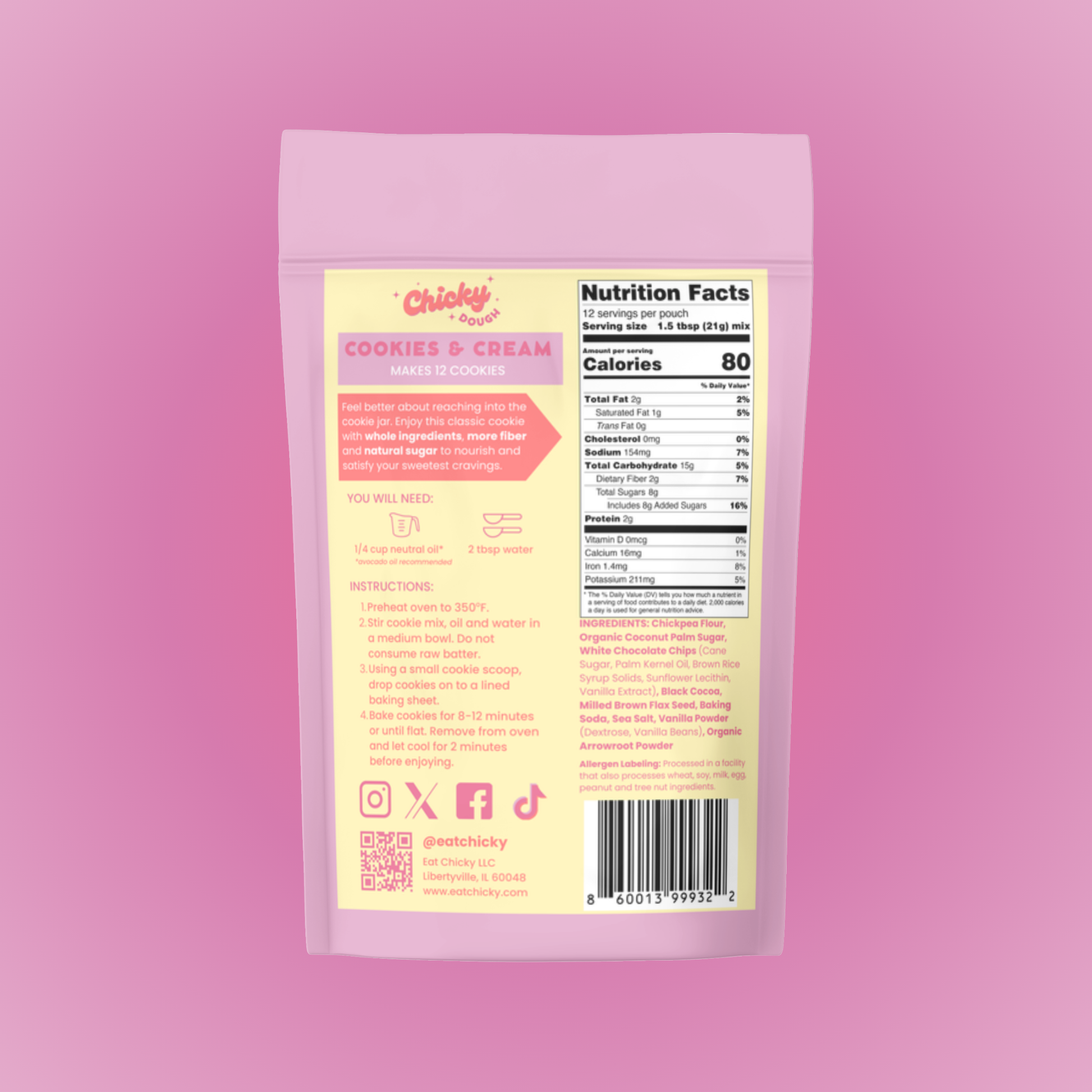 Our Cookies & Cream mix blends a rich, chocolatey dough with creamy white chocolate—so every bite tastes like flavor you know and love, without any of the junk. Made with chickpea flour and naturally sweetened with coconut sugar, this cookie is waiting to be dunked in your favorite plant-based milk.